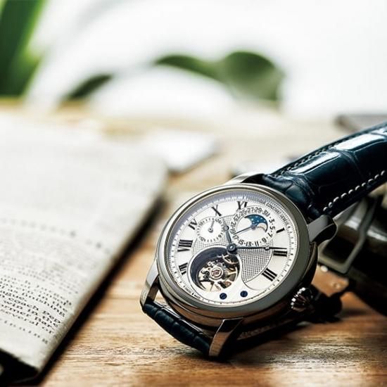 自動巻き〔自社ムーブメント FC-945〕、日付針、ムーンフェイズ、24時間針、ハートビート、ケース径42mm、ケース厚11.6mm、5気圧防水、ステンレススチール、アリゲーターストラップ