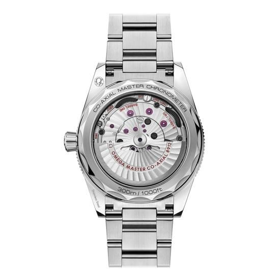 人間工学に基づいたステンレススティール製ブレスレットが合わせられたタイムピースの裏面には、サファイアクリスタルガラスのケースバックを備え、オメガ コーアクシャル マスター クロノメーター キャリバー8912を眺めることができます。