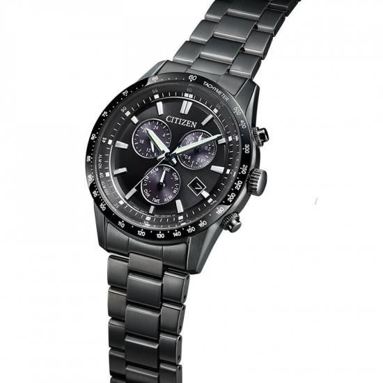 トレンド感のあるデザインに仕上げたクロノグラフモデル。段差のある見返しリング、カット面を大きく持たせたインデックス、太くしっかりとした形状の針がスポーティな印象を演出します。オンオフ問わず幅広いファッションにマッチする一本です。