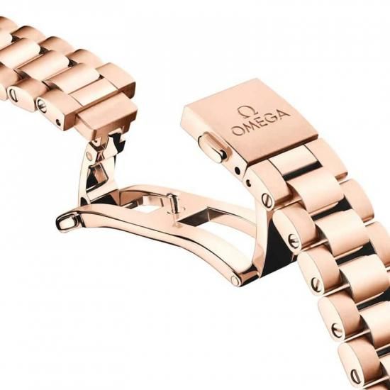 フォールディング バタフライクラスプとオメガのコンフォートリリースシステムが付いた、ポリッシュ&ブラッシュ仕上げが施されたラウンド型のコマから成る18Kセドナ™ゴールド製一体型ブレスレットが合わせられています。