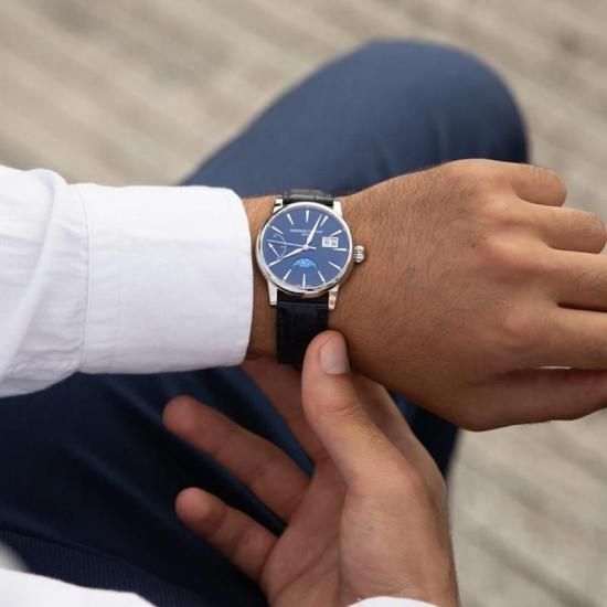 ブランド初となるビッグデイトとムーンフェイズ機能を持つ31番目の自社開発キャリバー<FC-735>を搭載した「クラシック パワーリザーブ ビッグデイト マニュファクチュール」は創業35周年を記念して製作されました。クラシックなケースに、3種のコンプリケーションが美しい調和を描き収められています。いずれの操作も3時位置のリューズ一つで行うことができます。特別な時計知識が無くても扱える手頃な価格の時計を提供する、というフレデリック・コンスタントのモットーが反映された、日常使いに最適なモデルです。
