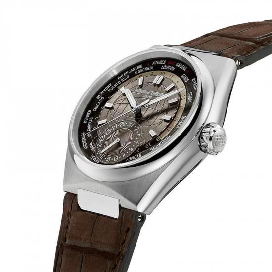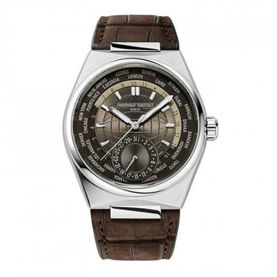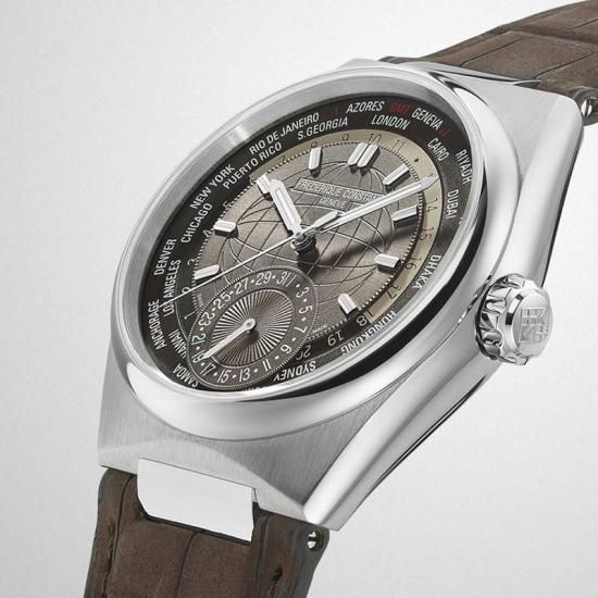 自社製キャリバー(FC-718)を搭載、地球をモチーフにした文字盤のワールドタイマー。あなたを世界の旅へといざないます。全体をチョコレートカラーでまとめ、都市表記やデイト表示をホワイトに、時針と分針には夜光塗料を施し視認性を高めました。24時間・デイト表示、都市表示ディスクの設定は、簡単にリューズのみの操作で行えます。また、2 本のストラップが付属。ブレスレットへ付け替えればアーバンシックスタイルへ、ラバーストラップへ付け替えればラグジュアリースポーティーテイストへ、さまざまなスタイルをこの1 本で叶えることができます。