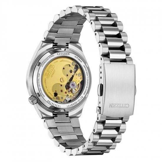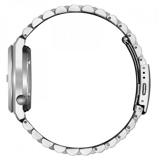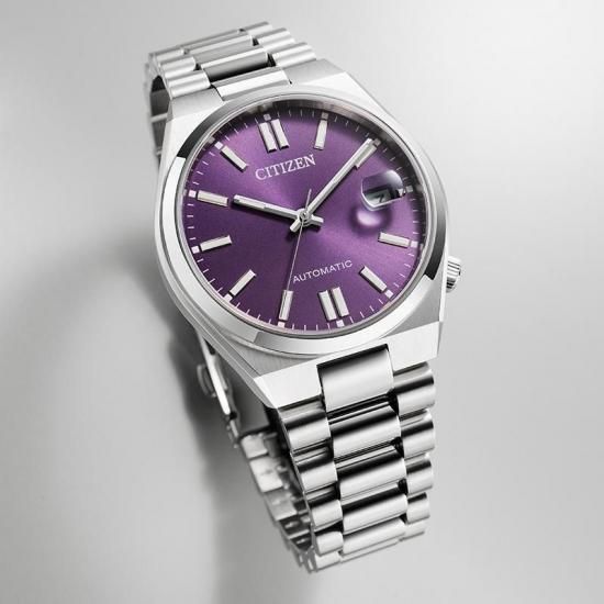 発色の良い文字板にシンプルでベーシックな針とインデックスを組み合わせ、すっきりとしたデザインが魅力の機械式時計です。スポーティなケース形状と腕なじみの良い3列バンドで付け心地の良さにもこだわり、カレンダー部分には視認性を高める拡大鏡レンズを採用しました。シースルーバックの裏ぶたで、機械式時計ならではの回転する錘(おもり)やメカの動きを楽しめます。