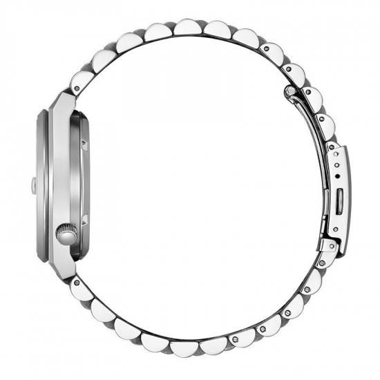 発色の良い文字板にシンプルでベーシックな針とインデックスを組み合わせ、すっきりとしたデザインが魅力の機械式時計です。スポーティなケース形状と腕なじみの良い3列バンドで付け心地の良さにもこだわり、カレンダー部分には視認性を高める拡大鏡レンズを採用しました。シースルーバックの裏ぶたで、機械式時計ならではの回転する錘(おもり)やメカの動きを楽しめます。