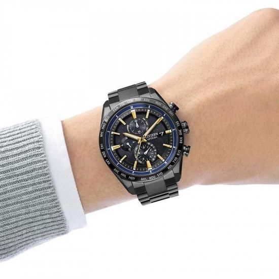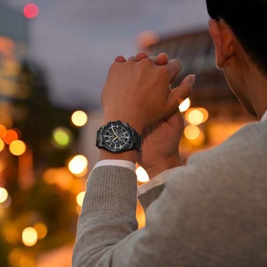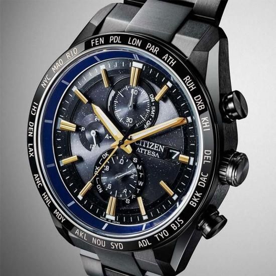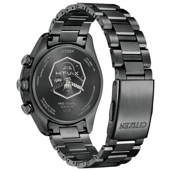 微細なラメがきらめくブラックの文字板は宇宙空間を表現しました。文字板を囲むリングには「HTV-X」が羽のように伸ばすソーラーセルをイメージした深いブルーを採用。さらに、「HTV-X」のボディカラーに着想を得たイエローゴールドの針とインデックスが、堂々とした存在感を放ちます。裏ぶたには「HTV-X」のミッションマークを刻印しました。