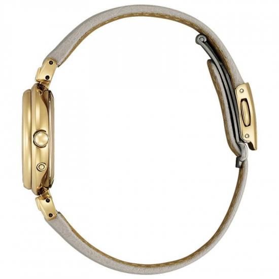 水面の波紋を思わせる、優しく丸みのあるベゼルとケースライン。雫に見立てたミルグレインをあしらった、ミルグレインドロップガラス。文字板には、露のようにキラキラ輝く8個のカットパーツと、9時位置にセッティングされた雫型のカットパーツ。