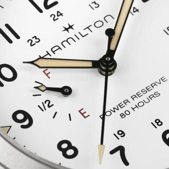 「カーキ フィールド メカ パワーリザーブ」は、「カーキ フィールド」コレクションの伝統的なデザインと欠かせない機能性を尊重しながら、現代的な機能や、最新のウォッチメイキング技術や革新性を取り入れています。ETA社がハミルトンのためだけに開発した、新しいH-23手巻きムーブメントを搭載し、初めて標準持続時間80時間をダイヤル上で直接確認することができるようになりました。ラギッドなカーキグリーンのNATOストラップを備えたホワイトのダイヤルには、誇らしげに「power reserve 80 hours」(標準持続時間80時間)と表示され、「F」で満タンを、「E」で空であることを示し、実用性を重視したこの特別な機能を強調しています。